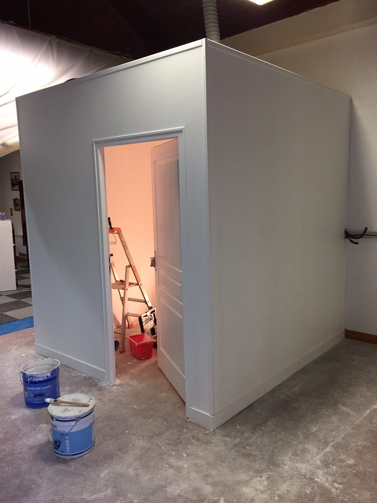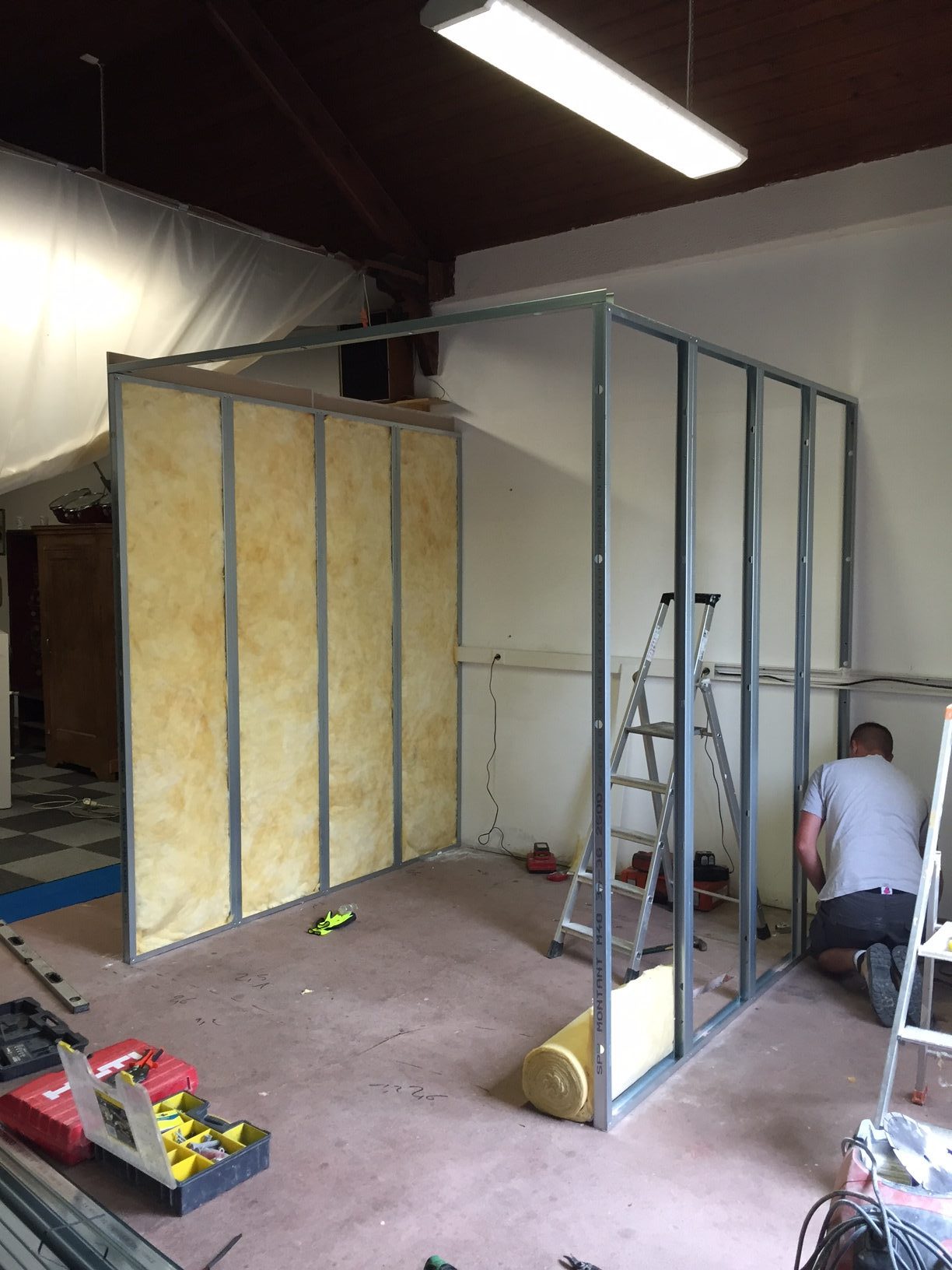 Nous avons réalisé la création d’une pièce sur la ville d’Orléans : cloison et placage, pose des rails, isolation, enduits, peinture et raccordement de plomberie…